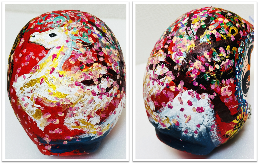 背中には白馬・桜・富士山が描かれています。